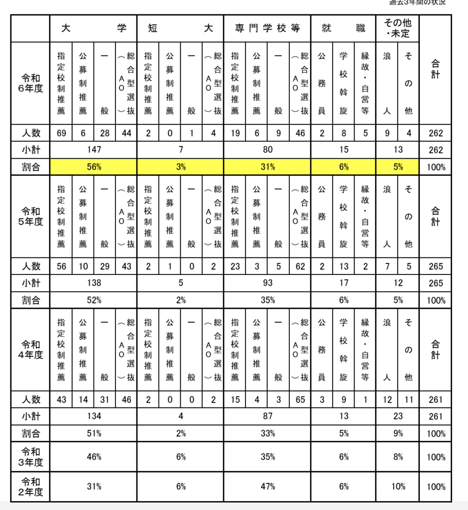 ご覧の通り年々大学進学者の割合が増え、令和6年においては卒業生の半数が大学進学となりました。